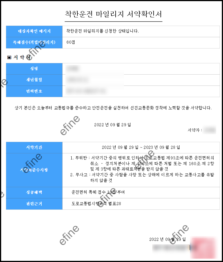 착한운전 마일리지 10점은 서약한 내용을 지켜야만 받습니다. 서약 기간 1년 동안 아래 내용의 무위반·무사고를 지켜야만 합니다.
