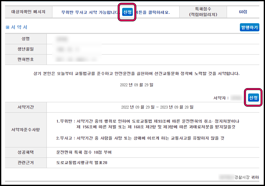 만약 서약 실천 기간 중 교통사고를 유발하거나 교통법규를 위반한 경우 그다음 날부터 다시 서약을 할 수 있습니다. 또한 범칙금이나 과태료 미납금이 있으면 신규 서약 등록이 불가합니다.